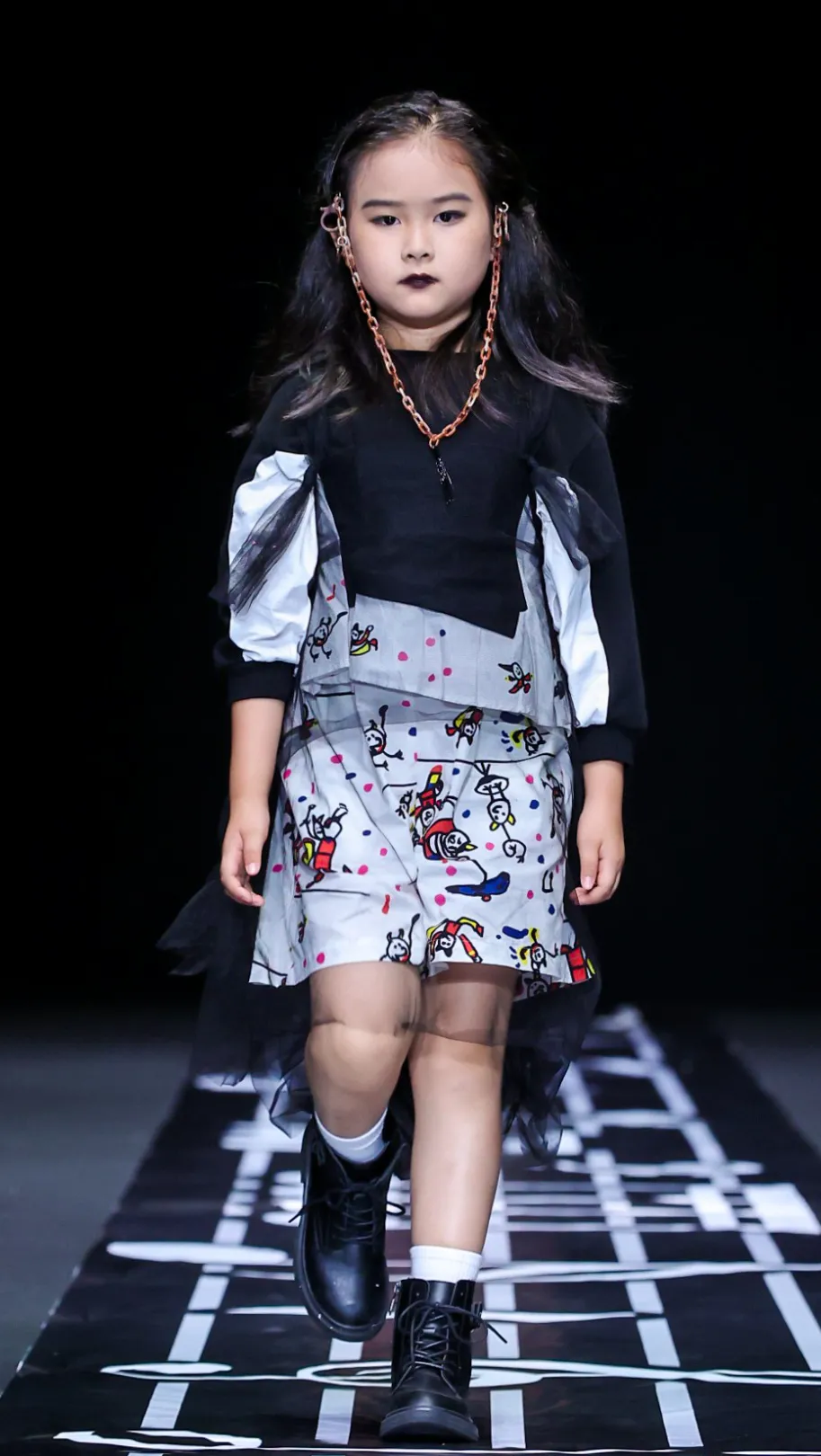 弥加设计J11品牌上演一场怪诞的摇滚音乐服装秀,本季将怪龙兽乐队作为一支虚拟的乐队呈现在本次秀场上,手绘涂鸦的怪兽跃然而上,在衣服上每一个角落呈现。手绘图案来自7岁的MIJA先生,将怪龙兽乐队的色彩与不同性格感染而上,在音乐里懂得享受音乐带给他们的快乐,音乐与滑板,轻松与快乐的涂鸦街头文化。本次设计系列更多将荧光色彩与黑色结合起来,通过格子与荧光的配合混搭,形成本季依旧酷酷的怪龙兽小孩。该系列里也增加了环保型面料,可降解尼龙材料以及杜邦纸面料作为结合。弥加设计与童模传说共同将新时代少年的热血,音乐梦想通过服装系列展现。跨界艺术品牌J11通过一次一次的不同刷新,展现IP怪龙兽的不同,插画,音乐,艺术的多种方式结合是品牌本身理念的传达,在每一次传达的过程中都是对未来的期许。